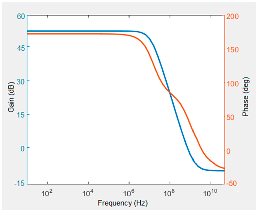 Frequency response of the readout circuit. The gain is around 45 dB with a 3 dB frequency of 10 MHz, close our target value. The modeling results indicate that the system operation is stable within the designed bandwidth.
