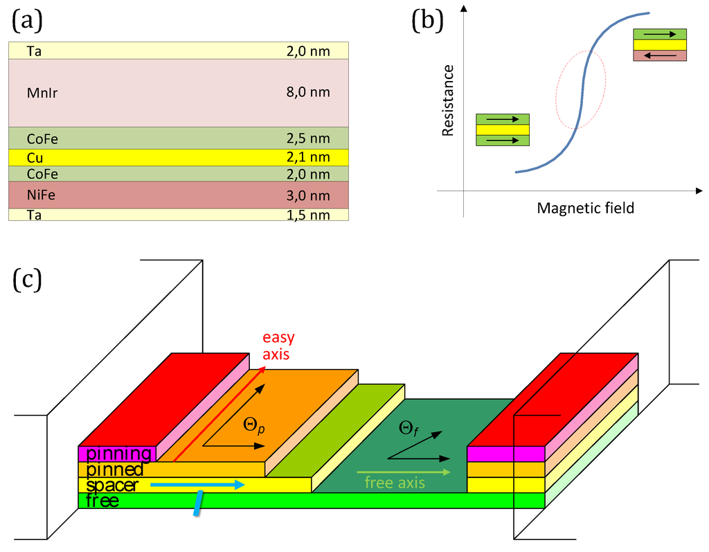For linear applications, and without excitation, pinned (easy axis) and free layers are preferably arranged in a crossed axis configuration (at ), as depicted in Figure 1c. In this way, the linear range, highlighted in Figure 1b, is improved and the sign of the external field is detected without the need of an additional magnetic biasing. The response this structure is given by [4]: