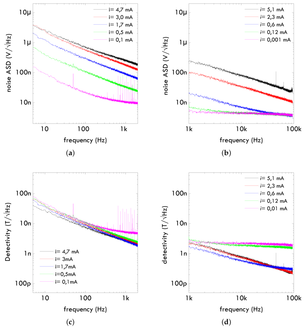 As a representative example, we will give noise data on spin valves based on the multilayered structure depicted in Figure 1a. Measured sensitivity was 20 mV/mT (1 mA bias). Measured bandwidth was above 1 MHz [11]. The measured noise is shown in Figure 2a,b. The behaviour is clearly observed and the thermal noise limit well defined. If we take into account the measured sensitivity, we can draw the detectivity understood as the field equivalent noise, that is drawn in Figure 2c,d. The benefits of the frequency is clearly stated. The increase of the bias current has an impact on the field detectivity at higher frequencies, but there is no effect in the regime [3].