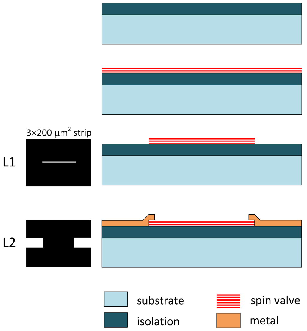 In order to have functional devices, GMR multilayered structures have to be patterned into elements with proper resistance values for being used as sensors (usually strips/rectangles). Then, these elements need to be contacted. Because of their particular interest we will come into detail on the typical fabrication process of spin-valve (SV) structures. For implementing a SV based device, only one lithographic step is required for patterning the structures (L1), and then another to design the contacts (L2), at the ends of the SV strip, as shown in Figure 3. The sheet resistance is inherent to the specific SV structure, but the final resistance value can be tuned by properly setting L and W of the strip. Usually, the minimum W value is constrained by the lithography resolution, and then the L value is obtained. For spin valve structures such as those described in the previous paragraph, devices of 200 m × 3 m give nominal resistances in the order of 1 kΩ.