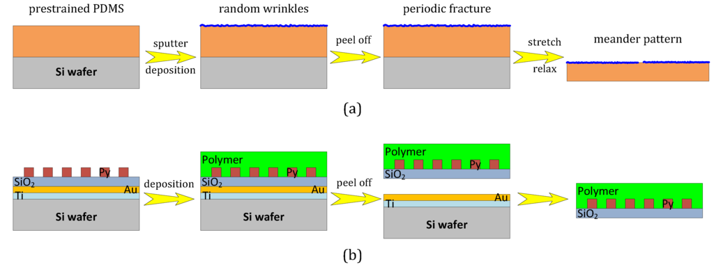 - Melzer, M.; Lin, G.; Makarov, D.; Schmidt, O.G. Stretchable Spin Valves on Elastomer Membranes by Predetermined Periodic Fracture and Random Wrinkling. Adv. Mater. 2012, 24, 6468–6472. [Google Scholar] [CrossRef] [PubMed]