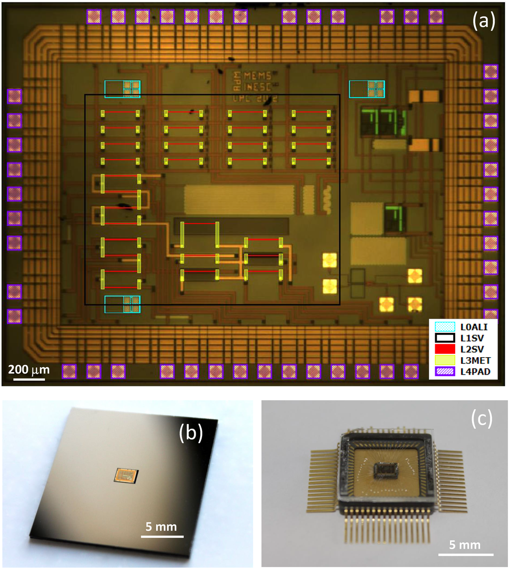 GMR based current sensors integrated with standard 0.35 m–3.3V–AMS (2.5 × 1.5 mm) chips. (a) Lithography masks for monolithic deposition of the spin-valve sensors; (b) Engineered sample holder substrate with the specifically machined hole; (c) Final encapsulated chip, after release from the holder.