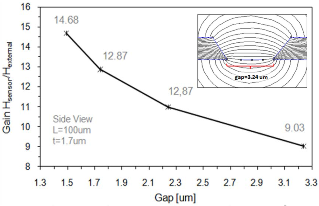 By decreasing the linear range of a GMR sensor its sensitivity is improved (the slope of the linear range of the response is increased, as illustrated in Figure 1b). When GMR multilayers are optimized, we can still use magnetic flux concentrators (MFC). In this sense, high permeability materials () of 100 to 500 nm thickness can be used as MFC. MCF are capable of increasing the magnetic flux density near the sensing elements in a factor up to 100. This gain is determined by the overall geometry, the separation between poles and the corresponding [36]. For a proper optimized design, numerical simulations are often used [37]. As an example, in Figure 7 we show the simulated gain as a function of the gap between MFC.