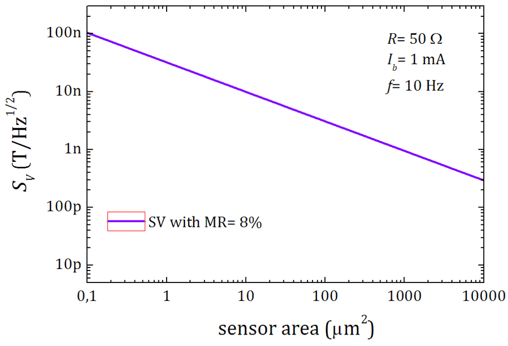 The limit of detection of a sensor is conditioned by its signal to noise ratio (SNR). Because the noise is also amplified with the signal, a good sensitivity is not sufficient, but also a low electronic noise. Because magnetoresistance sensors such as spin-valves are mainly affected noise in the usual ranges of application, this noise is minimized when the operating frequency is high enough. Being the noise an statistical mechanism, it decreases as the size of the sensor increases. In Figure 8 we show the theoretical detectivity at 10 Hz as a function of the magnetoresistance and sensor area for spin valve sensors, as reported in [36].