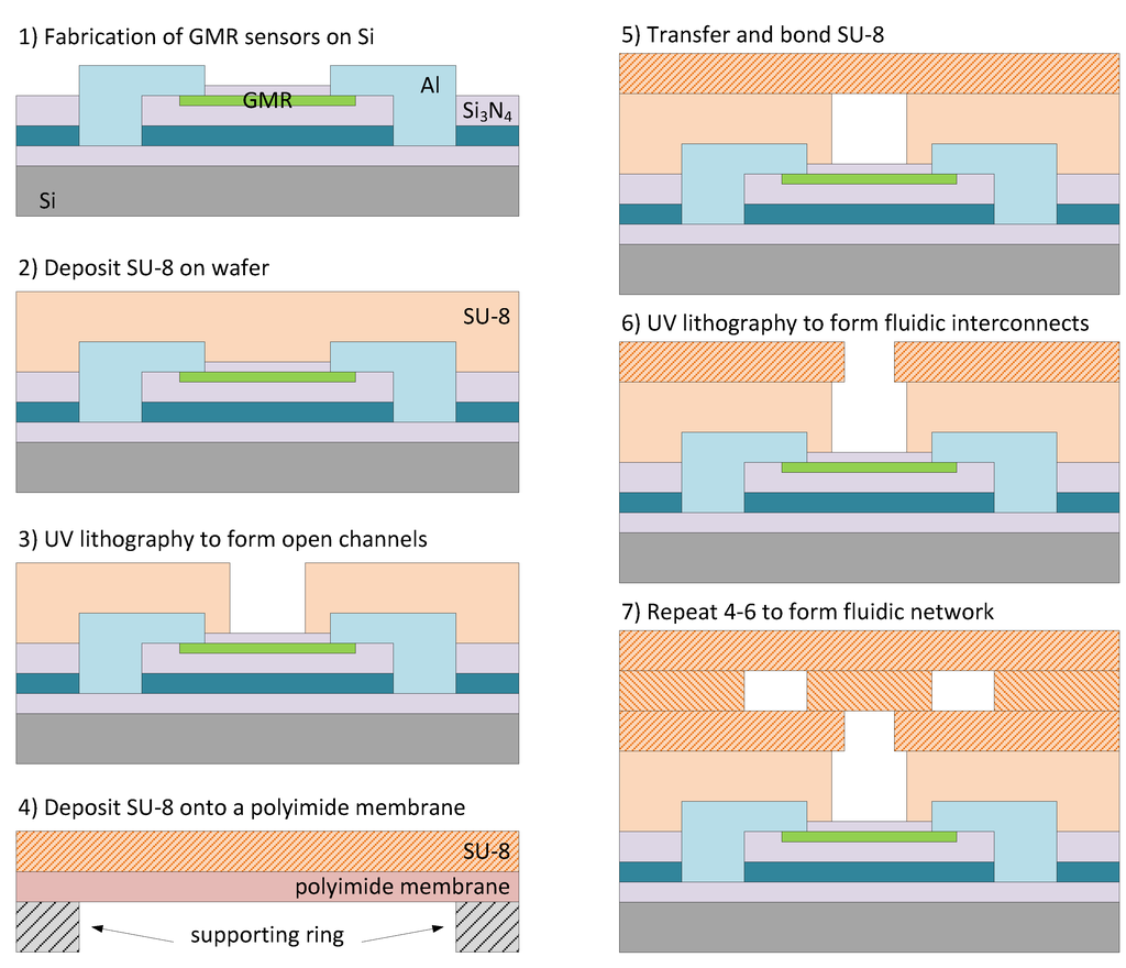 The process flow for integrating GMR sensors with 3-D SU-8 microfluidic system (as reported in [56]).