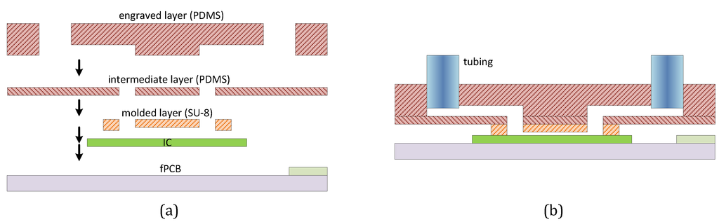 An elaborated assembly process is reported in [62] in order to minimize the handicap do to the size mismatch between sensors ICs (in the range of mm) and microfluidics systems (in the range of cm) by integrating three separate pieces of PDMS, as depicted in Figure 13a. Firstly, a millimetre sized piece of PDMS with soft lithography defined channels was aligned and bonded directly to the IC surface. Then, a centimetre-size PDMS membrane with laser micromachined through-holes interlayer was designed. Finally, a centimetre-sized PDMS piece with laser engraved microchannels was fabricated. The separate pieces of PDMS were bonded together by stamping them into spin-coated uncured PDMS on a Si wafer, aligning the pieces together under a stereoscope with a mask aligner, and baking. The final result is shown in Figure 13b.