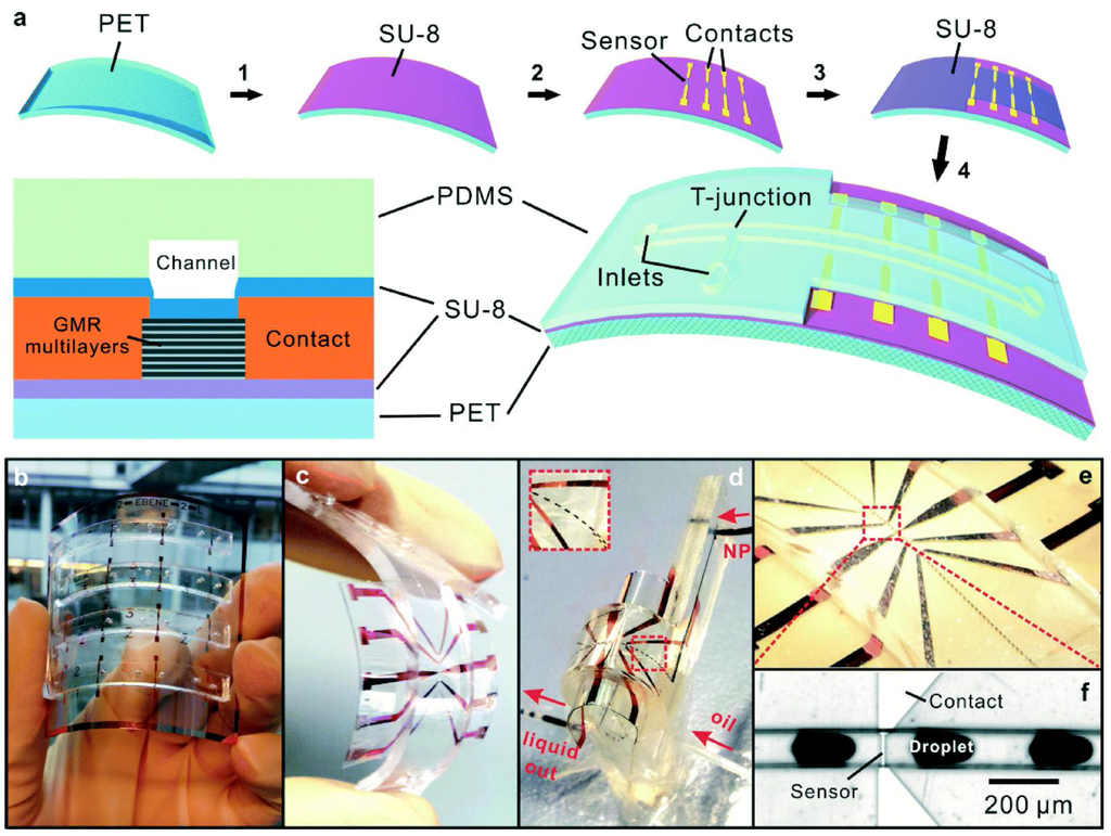 Recently, a full integration of GMR sensors with microfluidics into a flexible device has been reported in [63] and depicted in Figure 14. In this case, highly sensitive GMR [Py(1.5 nm)/Cu(2.3 nm)] multilayers (Py = NiFe) were deposited by magnetron sputtering onto a PET foil buffered with a SU-8 layer and patterned by lift-off. Contacts were also defined by lift-off. A SU-8 2 layer (700 nm) was used as passivation layer. The microfluidics channels were prepared in a PDMS layer deposited onto a Si substrate, and peeled off after the patterning. So the resulting microfluidics network was aligned with the chip and bonded with the help of a thermal process. The highest temperature achieved during the process was 200 C (during 5 min).