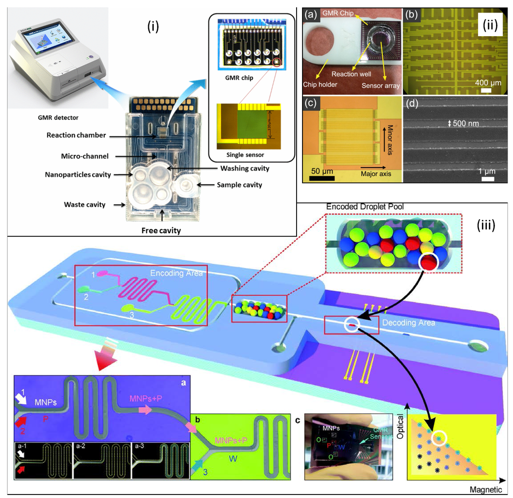 Full systems: (i) high-sensitivity cardiac multibiomarker detection system (reprinted with permission from [67]); (ii) biosensing probe station system for multiple protein assays [68]; (iii) Magnetofluidic platform for multidimensional magnetic and optical barcoding of droplets (Reprinted from [69]—Published by The Royal Society of Chemistry).