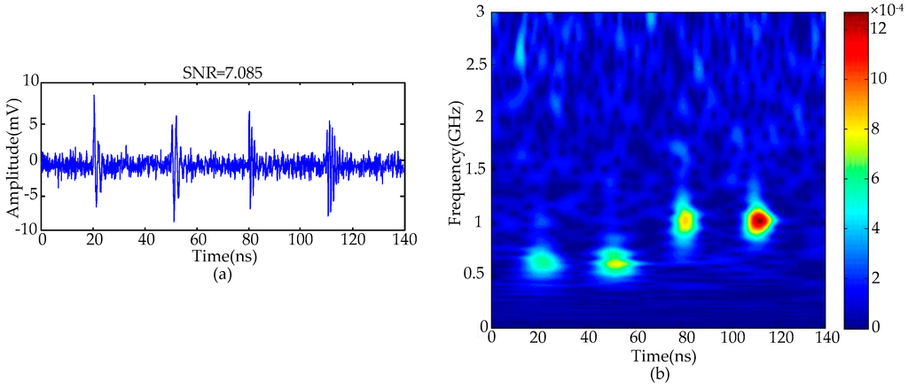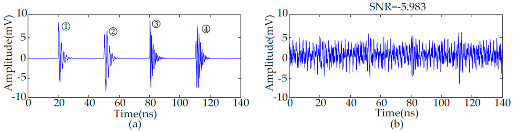 The waveform of practical periodic narrowband noise is sinusoidal with constant amplitude []. Equation (9) gives the mathematical model of periodic narrowband noise, where A is the amplitude assumed to be 2 mV. Based on the frequencies of wireless communication signals in China, fi is the frequency assumed to be 470 MHz, 900 MHz, 1800 MHz, respectively. The simulated UHF PD signals with periodic narrowband noise and Gaussian white noise are given in Figure 1b. The SNR of these noisy PD signals is −5.983 dB: