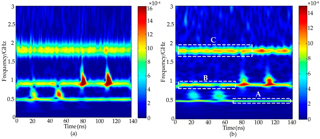 When the frequencies of the periodic narrowband noise and PD signals are partially overlapped, the PD pulse(s) are mixed with strong narrowband noise in a time-frequency distribution calculated by the S-transform, meaning that it is difficult to separate the narrowband noise from the PD pulse(s) []. The MTFM of the noisy PD signals calculated by the S-transform and the generalized S-transform (λ = 0.3), respectively, are drawn as a time-frequency distribution contour map in Figure 2. The comparison results show that higher frequency resolution can be obtained by utilizing the generalized S-transform (λ < 1), which may contribute to extract the narrowband noise features [].