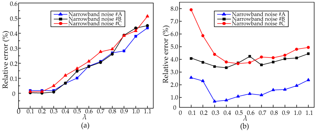 Compared with the original assumed value in the simulation, the relative errors of different calculated narrowband noise are given in Figure 3. Due to the improvement of frequency resolution, the relative errors of the calculated frequencies are reduced with the decrease in the value of λ. However, due to the reduction of time resolution, the relative errors of the calculated amplitudes are increased when the value of λ is lower than 0.3. The relative error is defined as: