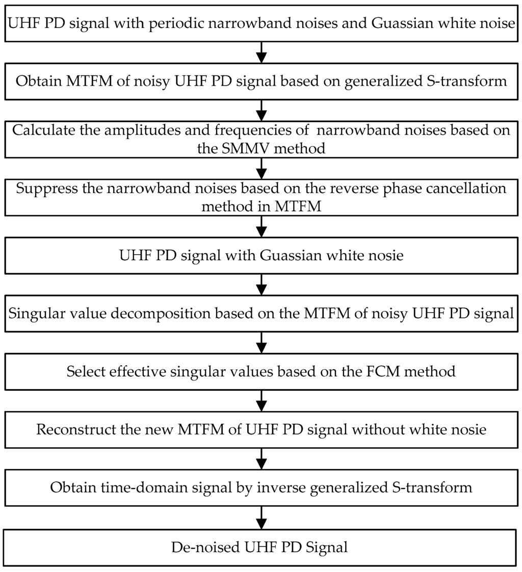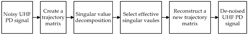 Suppression of Gaussian white noise is vital to extract accurate UHF PD pulse waveforms. The singular value decomposition (SVD) de-noising method is a nonlinear filtering method, which was shown to be capable of effectively suppressing white noise [,]. The conventional SVD de-noising method procedure is given in Figure 5 and is illustrated as follows.