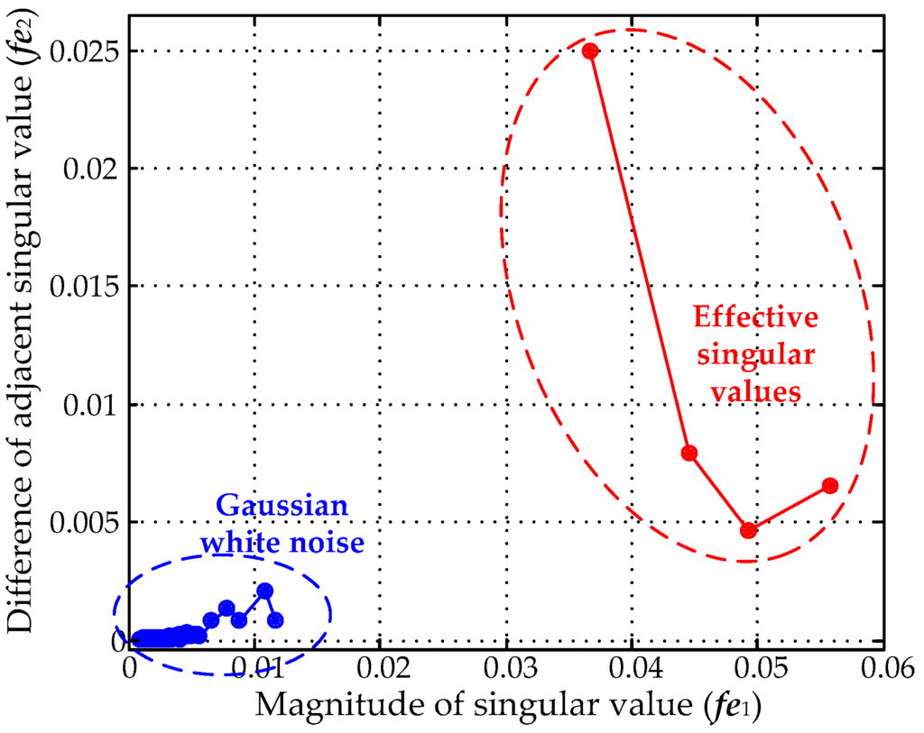 For the SVD de-noising method, the most important step is how to select the number of effective singular values, which largely determines the de-noising effect. The recovered PD signal is distorted when too small a number of effective singular values is selected, and residual white noise would remain when selecting over many effective singular values []. The methods proposed in [,] selected effective singular values by the hard thresholding technique, which may deteriorate the original UHF PD signal. In the MTFM, as Figure 4b showed, the module values corresponding to PD signal are greater with a concentrated distribution. On the contrary, the module values corresponding to Gaussian white noise are lower with a scattered distribution. Therefore, the magnitudes of singular values corresponding to PD signals are greater with a large difference. In this paper, a novel method for selecting effective singular values based on the fuzzy c-means (FCM) clustering algorithm is proposed. Features fe1 and fe2 are extracted as the features for clustering when selecting effective singular values. fe1 and fe2 are shown in Equation (17):