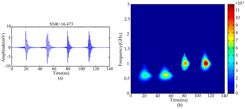 De-noised PD signals: (a) time-domain signals; (b) time-frequency distribution.
