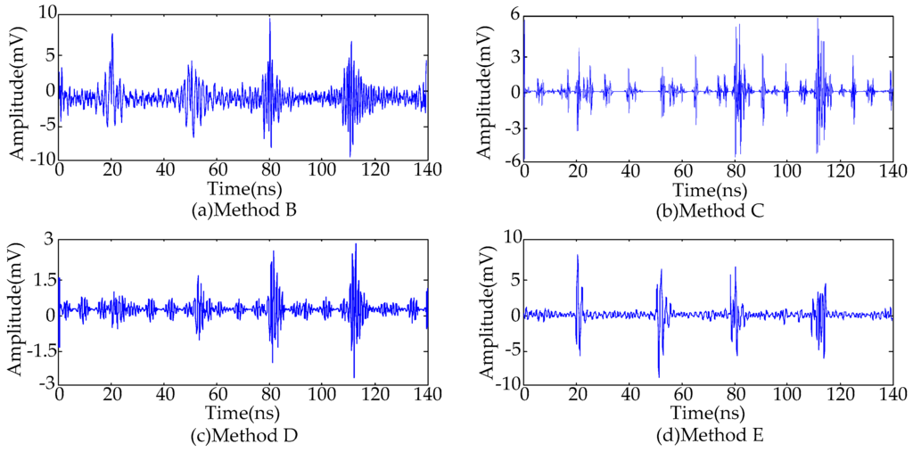 The procedure of the proposed de-noising method is summarized in Figure 10. For comparison, four conventional de-noising methods [,,,,,] were employed to suppress the noisy UHF PD signals shown in Figure 1b. The types of noise and de-noising techniques are shown in Table 3. The db2 and db8 wavelets are selected as the mother wavelet in Methods C and D where the decomposition level was set as 10. The de-noised PD signals are given in Figure 11. To compare the performance of various de-noising methods, the following evaluation parameters are introduced [,,].
