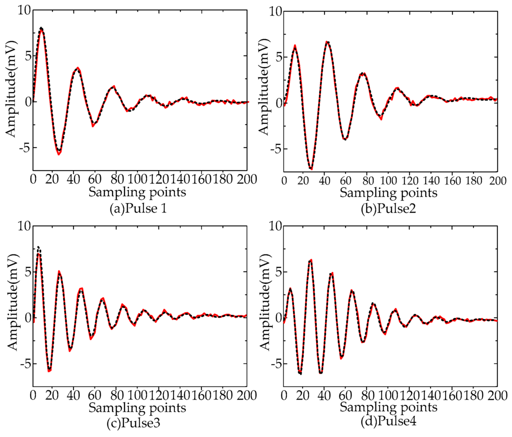 The pulse shapes of de-noised UHF PD signal utilizing Method A are given in Figure 12. The original and the de-noised PD pulses were drawn in the black dashed line and red solid line, respectively. The results show that the de-noising method proposed in this paper can recover the original PD pulses successfully and thus can assist in feature parameters extraction of UHF PD signals for insulation defect type recognition.