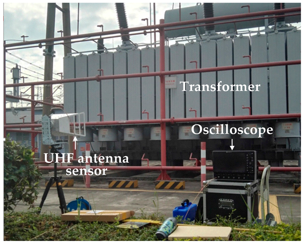 Partial discharge (PD) is a major cause and manifestation of insulation degradation. PD detection has been utilized for insulation condition assessment of high voltage (HV) apparatus []. When PD occurs in a HV apparatus, ultra-high frequency (UHF) electromagnetic waves are radiated from the PD source and propagate to the space of the substation through objects with no shielding effect []. External UHF antenna sensors can be utilized to detect UHF PD signals [], however, in field PD tests, the UHF PD signals detected by antenna sensors are vulnerable to interference due to the numerous electromagnetic waves present in space []. The background noise interferes with the PD detection and causes PD pulse shapes to be distorted, which may negatively affect HV apparatus fault diagnosis and localization accuracy [,].Therefore, noise suppression is a vital issue of field UHF PD signal testing.