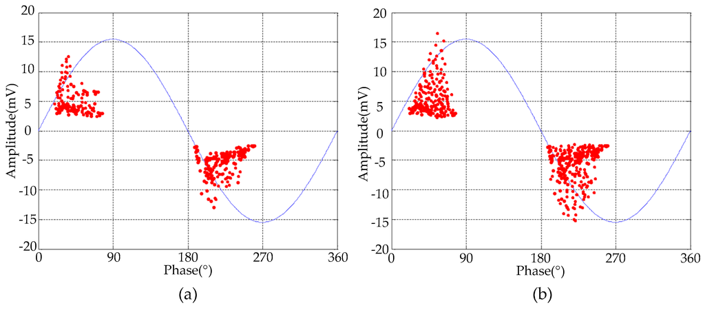 To verify the effectiveness of the proposed de-noising method for field detected PD signals, two UHF PD signals were detected from two 500 kV substations in Guangzhou, China. The picture of the field detection setup is given in Figure 13. An external horn antenna sensor (AInfo-LB530NF, A-Info Technology Co., Ltd, Chengdu, China) was employed to detect the PD signals. The operation bandwidth of antenna sensor was 0.5–3 GHz, and the maximum antenna gain was 11 dBi. The detected UHF PD signals were recorded using a digital oscilloscope (Lecory-WavePro740, Teledyne LeCroy, New York, NY, USA), which has 4 GHz bandwidth, 20 GSamples/s sampling rate, central processing unit (CPU) with 2.6 GHz dominant frequency and random access memory (RAM) with 2 G memory. The phase resolved partial discharge (PRPD) patterns corresponding to two detected UHF signals are given in Figure 14, and according to [,], the detected signals were originated from the PD sources. The time-domain waveforms and time-frequency distributions of two detected PD signals are given in Figure 15. It is obviously that narrowband noise and white noise interfered with the detected PD signals severely.