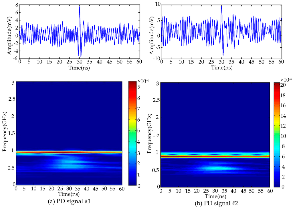 Waveforms and time-frequency distributions detected UHF PD signals: (a) signal #1; (b) signal #2.