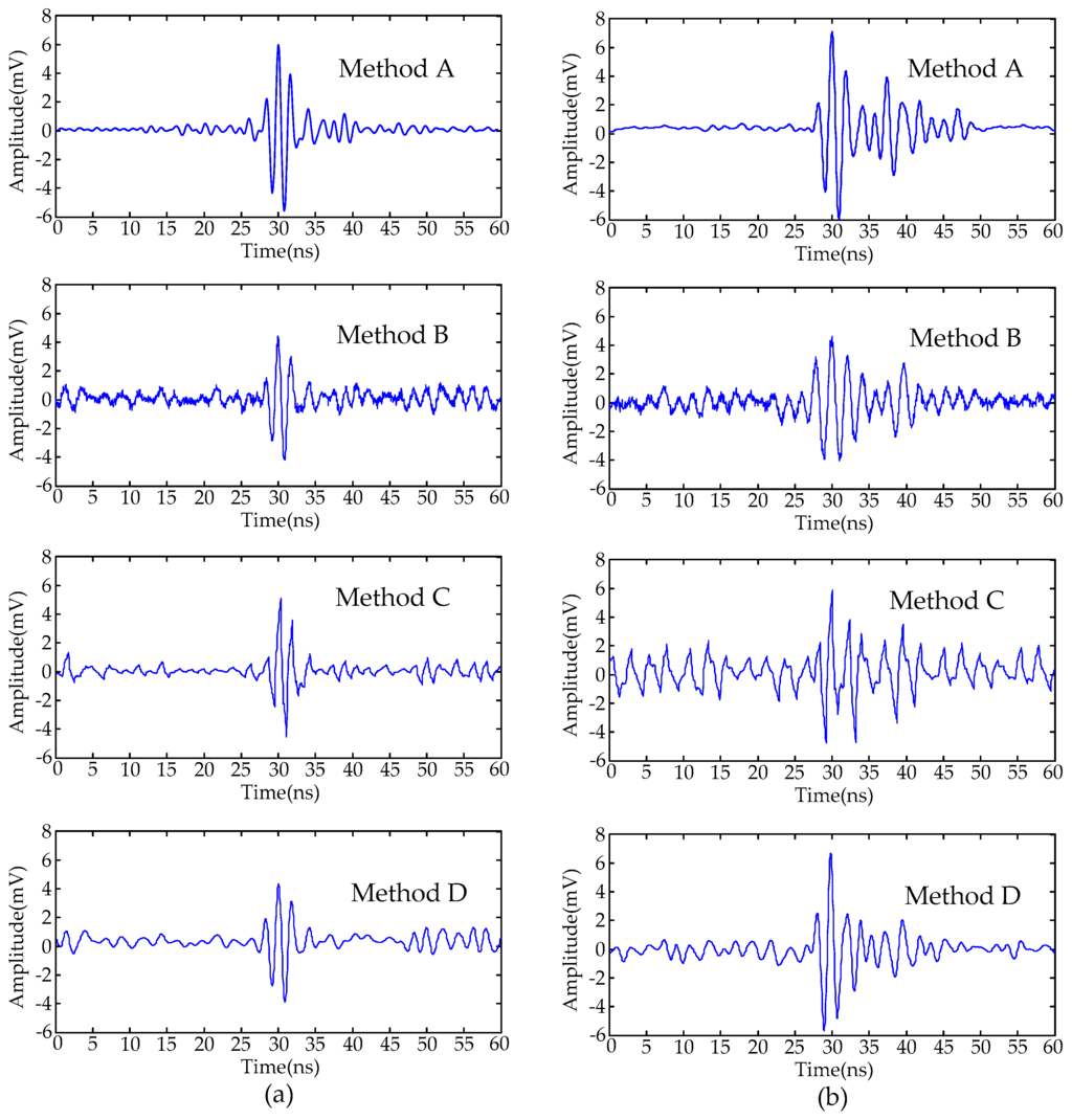 - Due to the large variation in time-frequency characteristics of UHF PD signals, de-noising results are affected by the mother wavelet selection []. In this paper, the de-noised signals with lower SNR and larger waveform distortion are obtained by utilizing Method C (select db2 wavelet); the de-noised signals with higher SNR and less waveform distortion are obtained by utilizing Method D (select db8 wavelet). Therefore, the de-noising effectiveness when using wavelet decomposition may become worse when an unsuitable mother wavelet is selected.