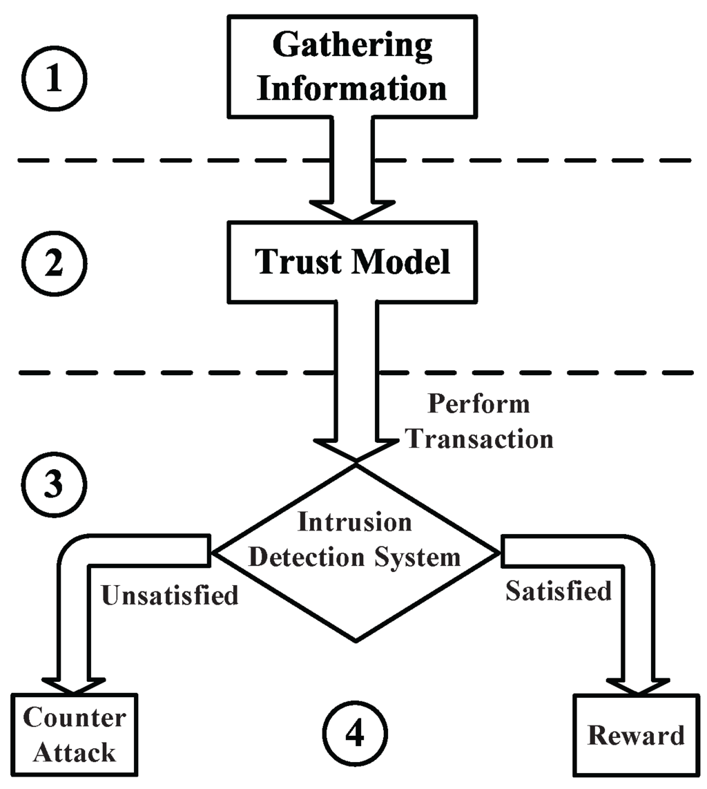 - Hao, D.; Adhikari, A.; Sakurai, K. Mixed-Strategy game based trust management for clustered wireless sensor networks. In Trusted Systems; Springer: Beijing, China, 2011; pp. 239–257. [Google Scholar]
