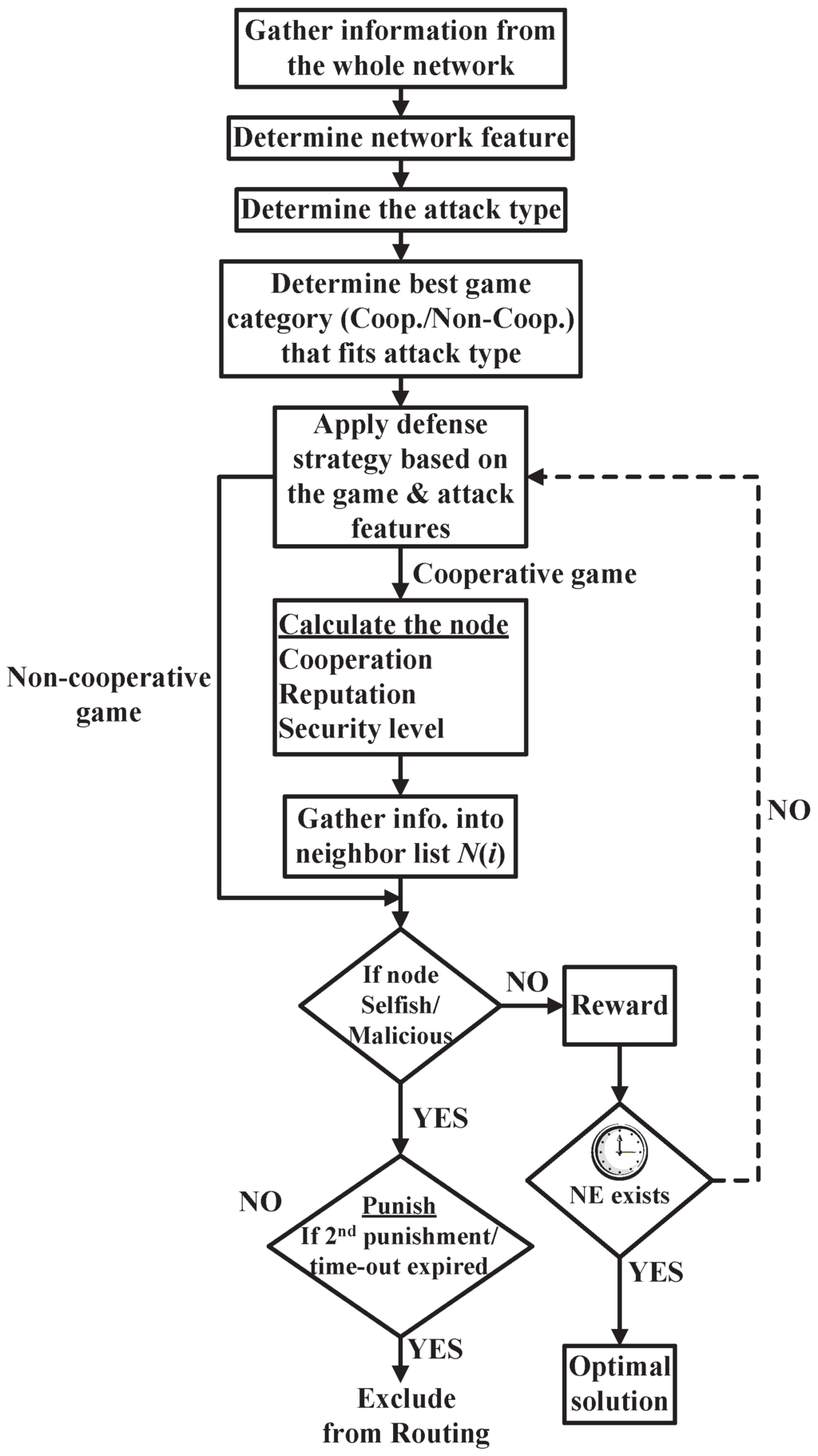 In this paper, we discuss a general trust model based on game theory to mitigate the WSNs security threats leading to detecting the malicious nodes and those nodes that act selfishly. Figure 3 illustrates the data flow of the general trust model in which the selected game is used to face the designated attack based on the observed information from the whole network. Apparently, this general system collects the needed information to select the best game that fits the detected attack and the mentioned classifications in Section 4. After this, the captured data are analyzed to pinpoint the network features, attack type, and appropriate defense strategy that will be applied, whether in a cooperative or non-cooperative game.
