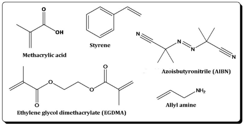 The structural formulae of all monomers and reagents are summarized in Figure 1. To synthesize MIPs, we dissolved 13 mg (0.12 mmol) styrene, 13 mg (0.15 mmol) methacrylic acid, and 60 mg (0.31 mmol) ethylene glycol dimethacrylate (EGDMA) in a reaction tube using 500 µL of a binary solvent mixture comprised of 200 µL of methanol and 300 µL of dimethyl formamide (DMF) and added 15 µL of an aqueous formaldehyde solution (37%–38% w/w, stabilized with 10% methanol). If the polymer contained primary amino groups for recognition (see Section 3.2), the reaction mixture also contained 13 mg (0.26 mmol) allyl amine before adding the template. After obtaining homogeneous, transparent solutions, we added 6 mg of azobisisobutyronitrile (AIBN) as the radical initiator. Polymerization took place by UV irradiation (λmax = 360 nm and 210 W) for 80 minutes until reaching the gel point of the mixture. Non-imprinted polymers (NIPs) were synthesized by the same procedure, replacing the formaldehyde solution with 9 µL of distilled water. Hence, the solvent mixtures of both MIPs and NIPs contain the same amount of water, namely, roughly 2% (9 µL of ~500 µL). For sensor measurements, 15 µL of this oligomer mixture were spin-coated onto one electrode pair of a dual-electrode QCM at 4000 rpm on a custom-made spin-coater, while the second pair was spin-coated with NIPs at the same speed.
