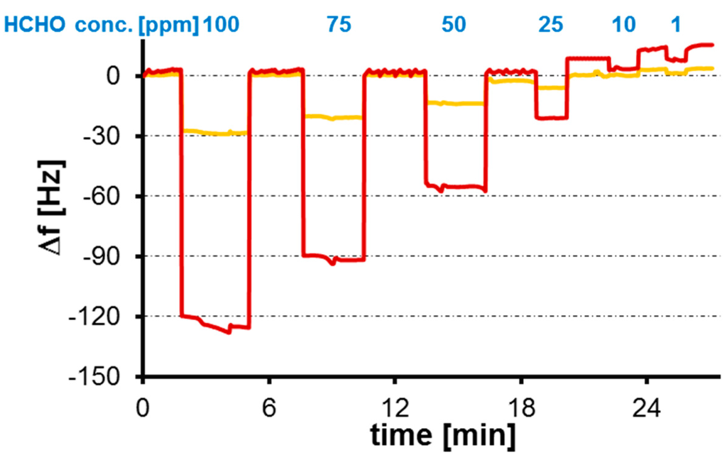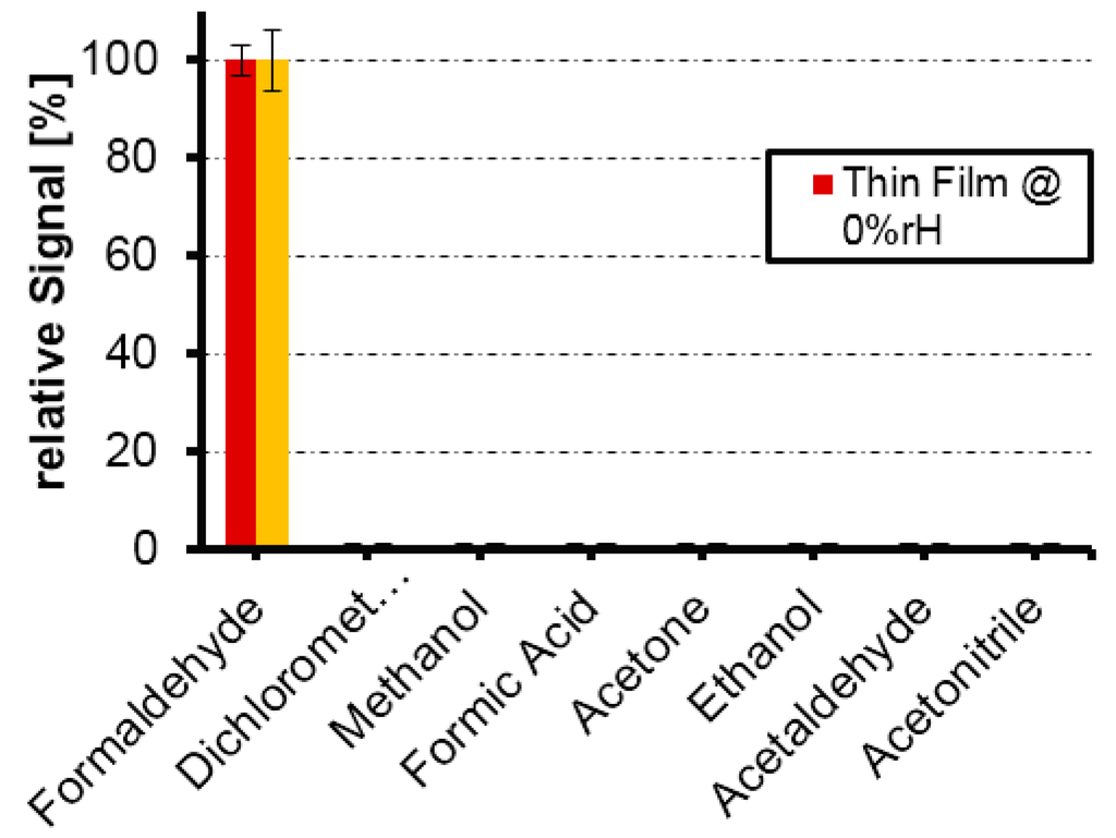 All those compounds are either somewhat similar in size or are chemically related to formaldehyde: Methanol and formic acid are the reduction and oxidation product of formaldehyde, respectively. Acetaldehyde also contains the CHO group and acetone at least the carbonyl functionality. The dichloromethane molecule is just slightly larger than formaldehyde. Surprisingly, none of these compounds gave rise to any sensor response revealing specific behavior of the sensor, as all frequency shifts stayed below the noise level of 1 Hz on the oscillator. For better visualization, Figure 7 summarizes the normalized sensor responses for these two systems: the frequency shifts in this case are related to the sensor response toward the 100-ppm formaldehyde. Error bars for formaldehyde responses correspond to standard deviations obtained for three parallel measurements. In the case of frequency shifts that are not statistically significant, the noise level of the oscillator was used to determine the errors.