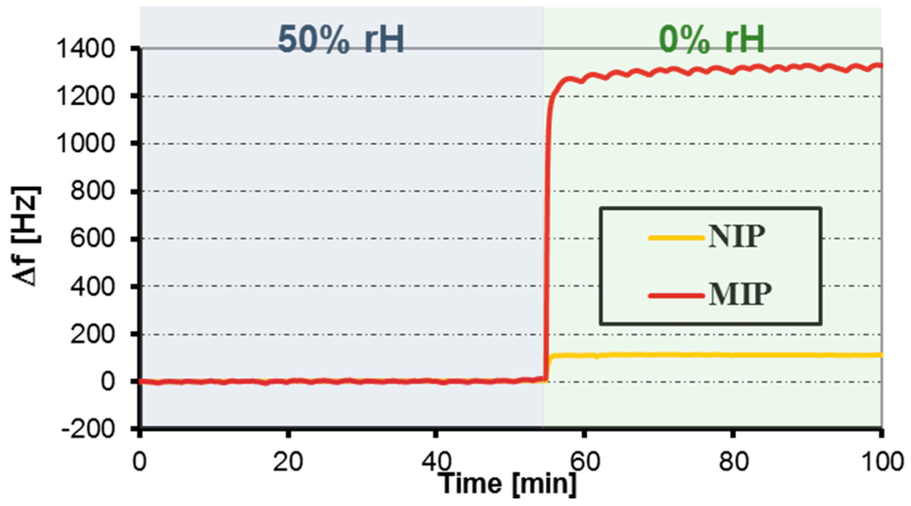 Despite these appreciable results, thin film sensors were not developed further after it turned out that they did not yield useful results in humid air, which makes them useless for operation in real-life conditions. One of the possible reasons of such a response is indicated in Figure 4: switching from 50% rH to dry air changes the frequency of the MIP-coated channel by almost 1400 Hz. It is therefore highly probable that water molecules block access to formaldehyde binding sites within the MIP thin film. Nonetheless, the MIP thin films serve as proof of the principle that appreciable formaldehyde sensor responses can be achieved by this strategy.