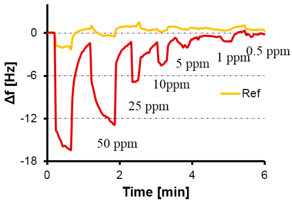 Adding allyl amine did not change morphology of the nanoparticles: AFM characterization of such NP layers showed particle diameters in the range of around 100–150 nm, which is the same size as for polymers without allyl amine. However, the additional monomer lead to highly appreciable sensor effects, as can be seen in Figure 6. Two aspects are immediately noticeable: Firstly, the material indeed leads to sensitive frequency responses toward formaldehyde vapors despite the fact that the corresponding MIP thin films (data not shown) did not give rise to measureable effects. Secondly, sensors based on MIP NPs respond substantially faster to analyte pulses compared with thin films. According to the data shown in Figure 6, equilibrium is reached within roughly half a minute for each vapor pulse. In the case of MIP thin films (see Figure 3), the same process lasts for around three minutes for each pulse. Again, this strongly suggests that accessibility of the respective binding sites in the material plays a seminal role in sensing. In the case of nanoparticles with a roughly 100-nm diameter, possible diffusion pathways are in the range of at least several tens of nanometers. Thin films, however, are typically 100–200 nm high on each electrode (as determined by network analyzer measurements) and have a diameter of roughly 6 mm (electrode diameter after screen printing is 5 mm, and the layers are somewhat wider). Thus, both the accessible surface is much lower than for NP, and diffusion pathways within the polymer can be expected to be much longer. The MIP NP sensor reaches LoD = 0.5 ppm formaldehyde vapor in humid air, which is the same as that for the thin film at dry conditions. During all our measurements (same quartz over several days), sensor signals returned to their respective baselines, strongly indicating reversible—i.e., non-covalent—binding.
