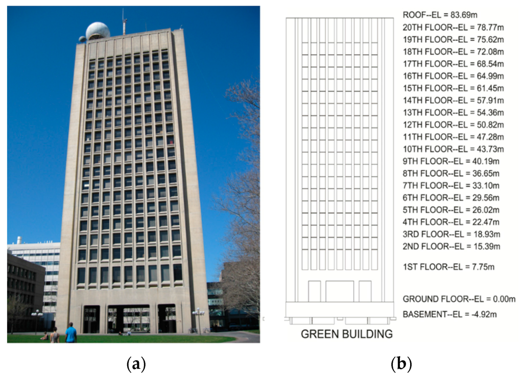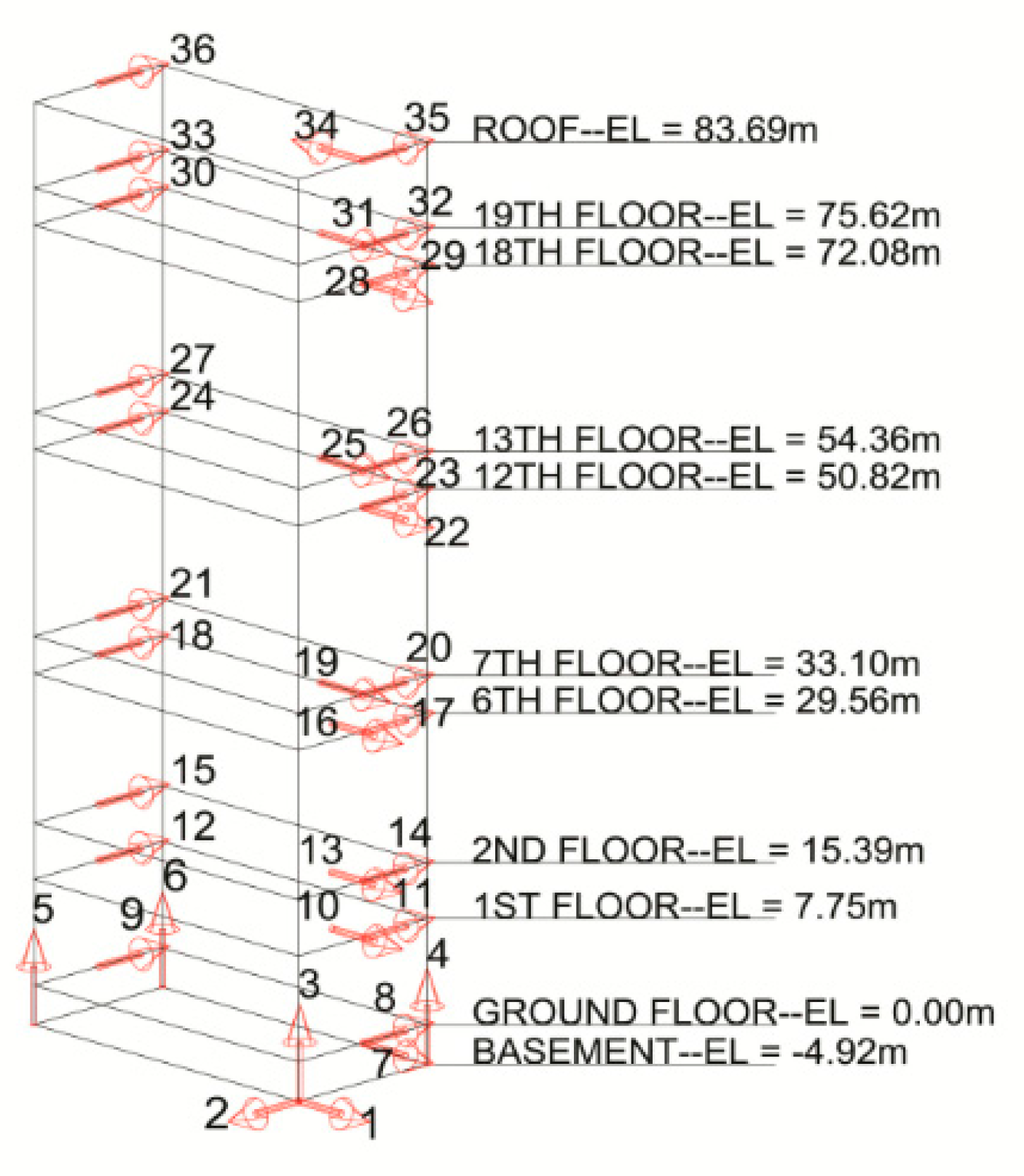 Kohler et al. [] carried out dynamic property measurements of the moment-resisting steel-frame Factor Building at the University of California, Los Angeles (UCLA), to assess how forces are distributed over the building. This 17-story building had been monitored using 72 accelerometers from 2002 to 2003. From this study, the fundamental frequencies measured from earthquake data are about 0.5 to 0.1 Hz lower than those corresponding to ambient vibration recordings which indicate softening of the soil-building system with increased vibration amplitudes. Those frequencies reverted to pre-earthquake levels within 5 min of the earthquake. Skolnik et al. [] carried out model updating and response prediction using a detailed finite element (FE) model and a lumped mass stick FE model based on measurement data for the Factor Building at UCLA. Nayeri et al. [] implemented two system identification methods to the Factor building based on ambient vibration measurements. The first method is a natural excitation technique [], and the second method is a time-domain identification technique for chain-like MDOF systems introduced by Masri et al. []. Lu et al. [] developed a 2-dimensional (2-D) nonlinear structural model for seismic analysis of super tall buildings using Shanghai Tower. The 2-D model includes nonlinear beam-column elements and shear spring elements. Foti et al. [] carried out output-only identification techniques and FE model updating on the Edifice A building, heavily damaged by the 2009 L’ Aquila earthquake.