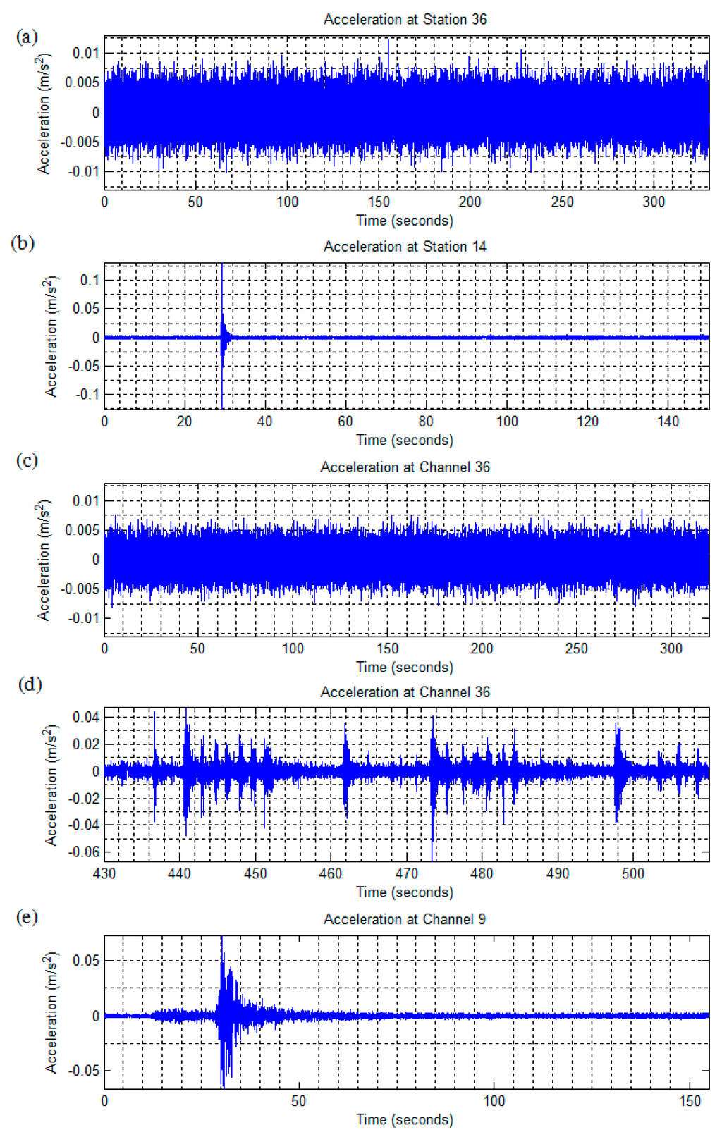 Acceleration response data was collected via an automatically triggered recording set off by an earthquake near Hollis Center (ME, USA), on Tuesday October 16, 2012. The recording began at 19:12:35 EST, and lasted 155 seconds. Weather conditions were clear, with negligible wind. The earthquake was of 4.0 magnitude, and the epicenter was located about 4 km outside of Hollis Center, which is located about 142 km from Cambridge (MA). A time-history of the event recorded at the Green Building’s ground level in the NS direction (accelerometer channel 9) is presented in Figure 4e.