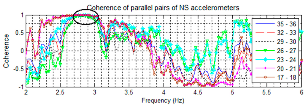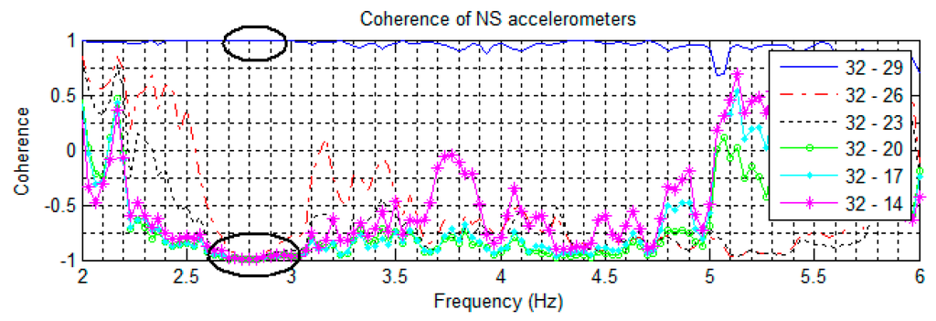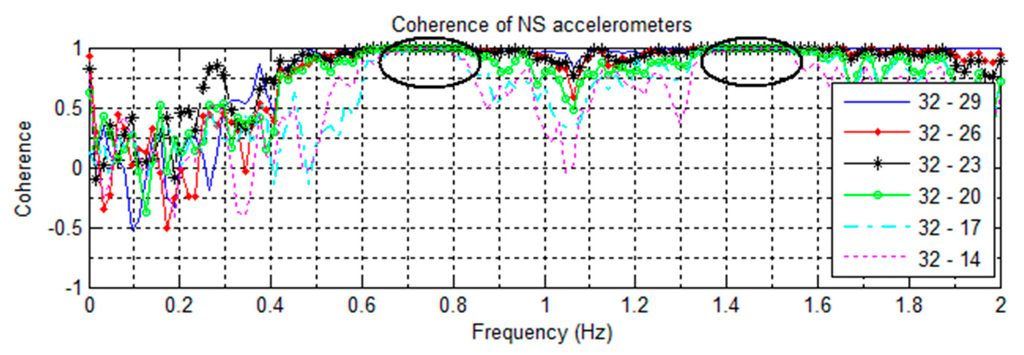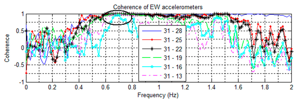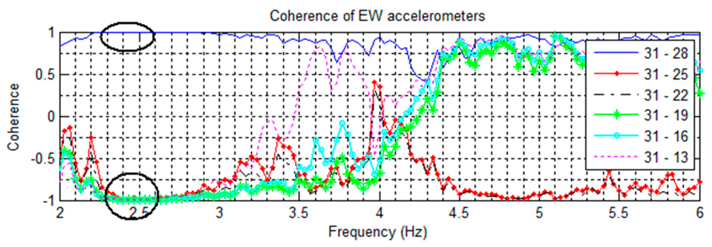 Signal coherences of pairs of NS accelerometers are shown in Figure 8, Figure 9 contains EW pairings, and Figure 10 compares parallel NS oriented accelerometers. In Figure 8, the coherence at 2.81 Hz in the channel 32–29 pairing is nearly +1 coherent; while the rest of the channels paired with 32 are nearly −1 coherent, indicating that channels 32 and 29 are moving in the same direction while the other NS channels are moving in opposite directions. This suggests a mode shape nodal point located between floors 13 and 18. Furthermore, in Figure 10 all NS accelerometers on the same floor have a strong positive coherence. Both of these features indicate the 2nd NS mode to be at 2.81 Hz. In Figure 9, a similar split occurs in the coherences at 2.51 Hz, with channels 29–31 strongly positive while the rest are strongly negative, indicating a second EW mode. The cross-over point of the EW second mode shape also appears to be between floors 13 and 18.