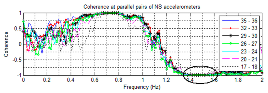 In Figure 5, all the NS sensor pairings at 0.74 Hz show a very strong positive coherence of +1. Likewise, in Figure 6, the EW sensor pairings at 0.68 Hz show strong positive coherence. This shows the motions to be synchronous and corresponding to the fundamental NS and EW modes. In Figure 7, all pairings of parallel sensors show strong negative coherence at 1.47 Hz, indicating that the sensors are moving in opposite directions. This corresponds to the twisting motion of the first torsional mode. In the plot, all the pairs also have strong positive coherence at 0.74 Hz over the height of the building, indicating that the building is swaying symmetrically in the NS direction.