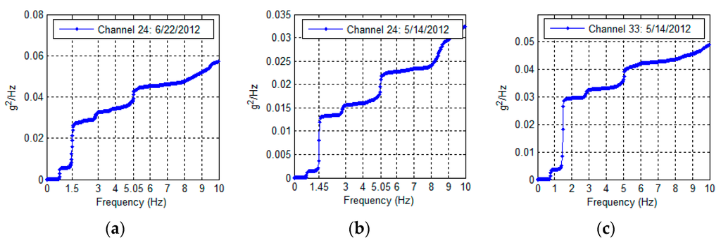 Cumulative spectral power at floor 12 during 22 June ambient vibrations (a) and the 14 May event (b) and cumulative spectral power at floor 19 during the 14 May event (c).