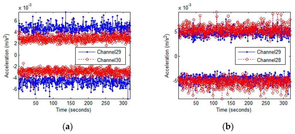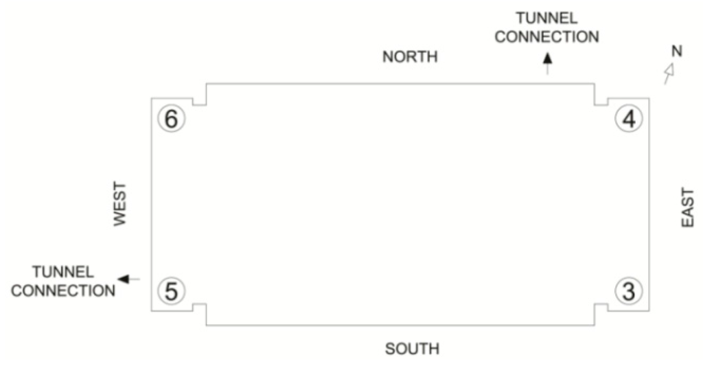 The Green Building is instrumented with 36 uniaxial EpiSensor ES-US force balance accelerometers, which sample at a rate of 200 Hz across a recording range of ±4 g. These are designed for structural monitoring purposes and produced by Kinemetrics []. The accelerometers are cable-connected to a central data recording station and time-synchronized using the global positioning system (GPS) with accuracy to within 1 ms. The data recorder is the Granite model, also produced by Kinemetrics []. The system is internet-connected and set to trigger if accelerations over 1 gal (0.01 m/s2) are detected. Acceleration data can also be collected through on-demand recordings and real-time streaming.