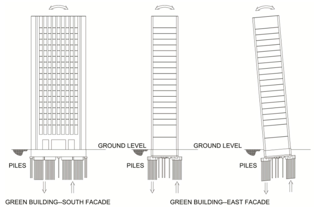 Base Rocking in the Green Building; along the NS and EW axis (Left and Middle). Rocking consists of a rigid-body rotation (exaggerated) and pile uplift and sinking (Right).