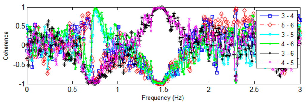 All natural frequencies detected using coherence spectra analysis have broad margin as shown in Figure 5, Figure 6, Figure 7, Figure 8, Figure 9 and Figure 10. In order to improve the accuracy of the calculated modal properties, operational modal analysis (OMA) methods such as the enhanced frequency domain decomposition (EFDD) in the frequency domain and the stochastic subspace identification (SSI) in the time domain can be considered to analyze the experimental data more accurately ([,]).