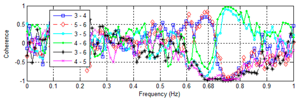 A detail of Figure 15 is shown in Figure 16. At 0.68 Hz, accelerometers on the same East or West façade of the building (3–4 and 5–6) have positive coherence, while those on opposite or diagonal sides (3–5, 4–6, 3–6, and 4–5) are negatively coherent. While there is some base rocking about the NS axis associated with the EW fundamental mode, the coupling and motion is not very strong. This corresponds to expectations, since the EW axis is in the building’s long direction, and significant base rocking would need to displace the foundation piles larger distances. Accelerometers on opposite diagonals of the base (3–6 and 4–5) are highly coherent while all others are strongly negative. This synchronous movement of opposite corners is expected of the torsional response in prismatic buildings, and indicates foundation flexure coupled with the fundamental torsional mode.