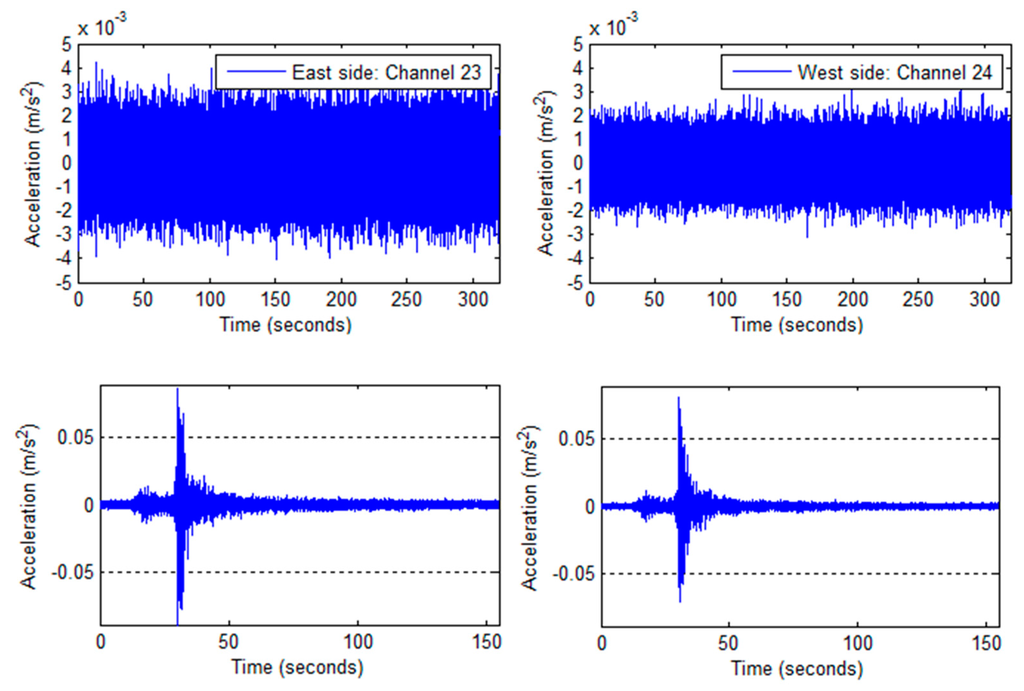 Accelerations from ambient vibrations (Top) and the Hollis Center earthquake (Bottom) at floor 12. Recordings from NS oriented accelerometers on the East side (Left) and West side (Right).