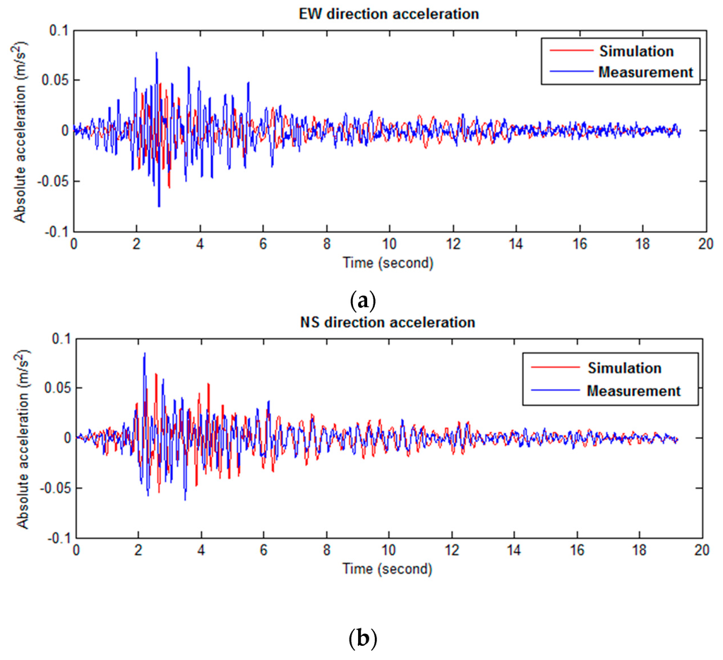 For the EW direction, Channel 7 is used because we do not have acceleration data from west facades of the building, and for NS direction average of the two related accelerations are used for the center of the mass because SLMM is a lumped mass model. In Equation (28) the root-mean-square errors are also calculated using the average of the two related displacements. Newmark-β time-step integration method has been used in the simulation for the SLMM. The incremental governing equations of motion for the structural system are expressed as: