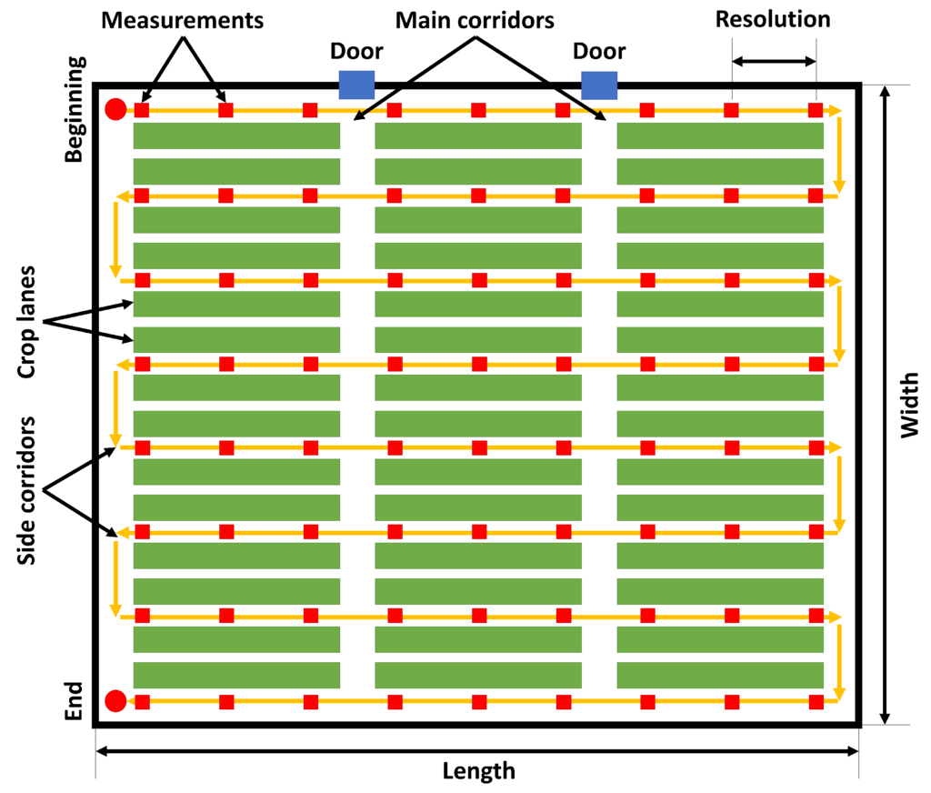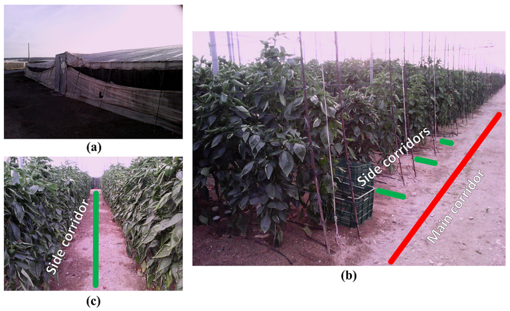 As can be seen in Figure 1, these greenhouses often present a front side with one or more doors that can be used for machinery, some main corridors with a width of around 2 m and some side corridors with a width of around 1 m.