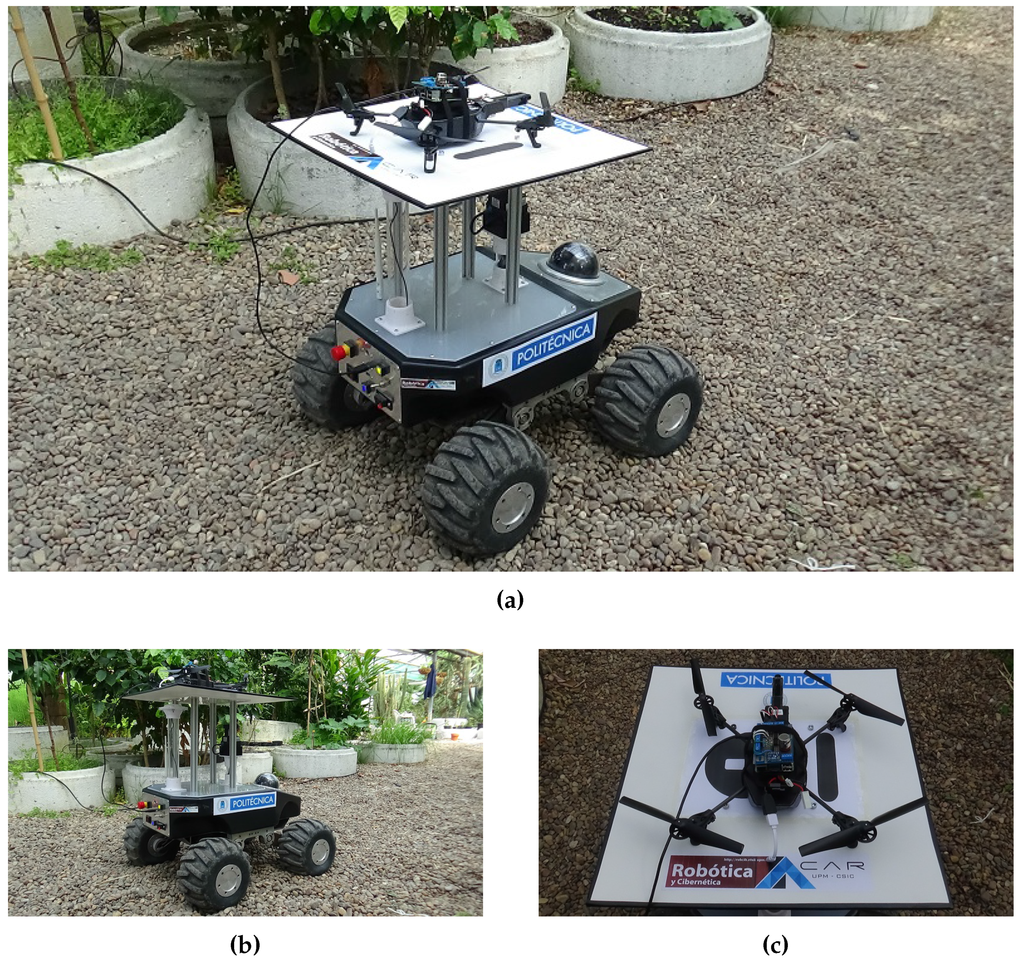 (a) Air-ground robot team; (b) Ground robot: Robotnik Summit XL; (c) Aerial robot: Parrot AR.Drone.