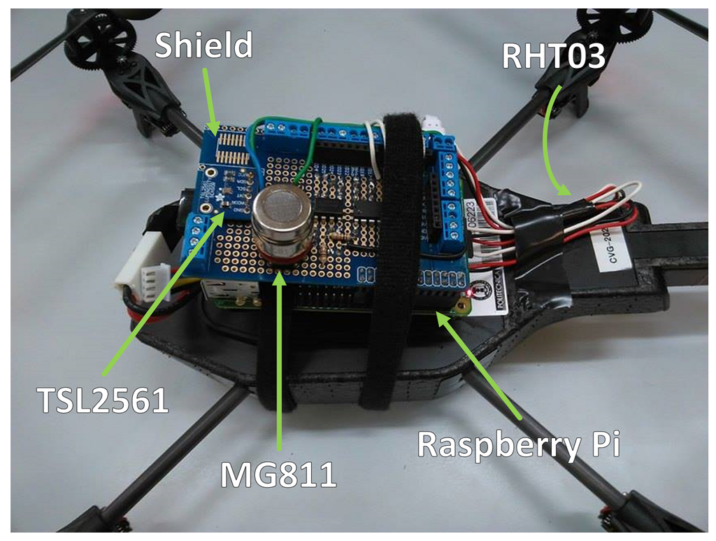 As shown in Figure 3, the integration of these sensors in the UAV was performed by using a Raspberry Pi. The RHT03 sensor is directly connected to a digital pin; the TSL2561 sensor is connected via I2C (Inter-Integrated-Circuit) using SDA (Serial Data Line) and SCL (Serial Clock Line) pins; and the MG811 sensor is connected to a digital pin through an ADC (Analog to Digital Converter). A program developed under ROS Hydro and Raspbian Wheezy reads the measurements of the sensors and sends them to the whole system.
