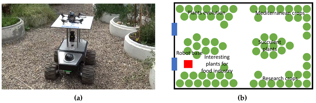 In previous works, we used an aerial robot [40] and a ground robot [43] to measure the environmental variables of greenhouses. In the first case, a mini-UAV was used to measure air temperature and humidity, luminosity and carbon dioxide concentration, whereas in the second work, a medium UGV was used to measure ground temperature and moisture. Additionally, we researched the air-ground cooperation applied to obstacle detection and mapping [47]. The proposal of this paper is to apply a team made up of these two robots. The robots are shown in Figure 2, and their main features are described below.