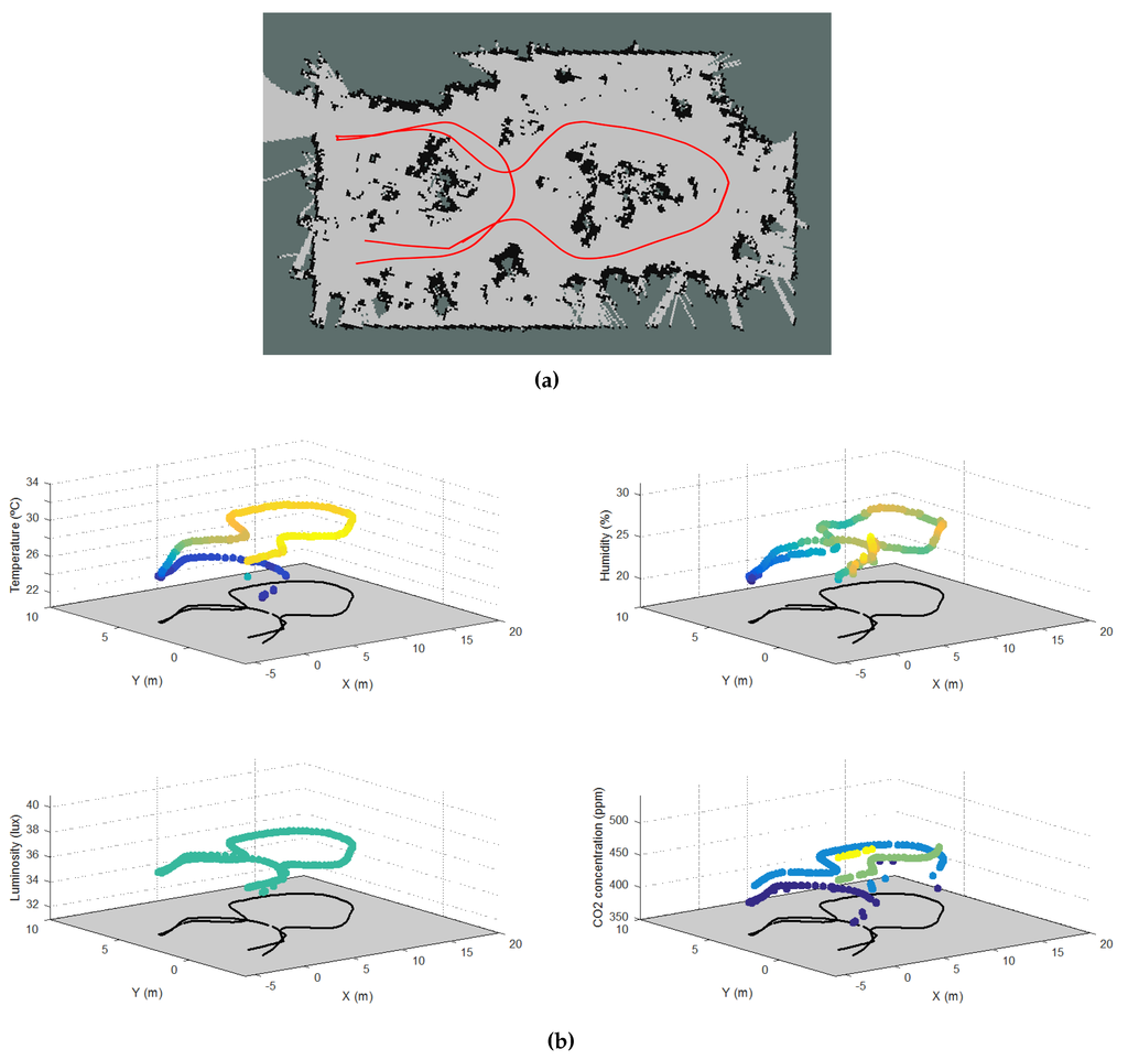 Finally, a complete set of experiments was developed in an educational greenhouse. This experimental greenhouse has an irregular layout in contrast to productive greenhouses, so the algorithms had to work under harder conditions. The experiments validated both the mapping and navigation algorithms of the ground robot. Additionally, the maps of environmental variables built from this robot showed consistent results. Finally, the aerial robot was used to perform short flights in the greenhouse, taking off from the UGV, flying around to take several measurements and landing back on the UGV. It must be remarked that those flights were carried out by manual control, although our intention is that in future works, they will be performed autonomously.