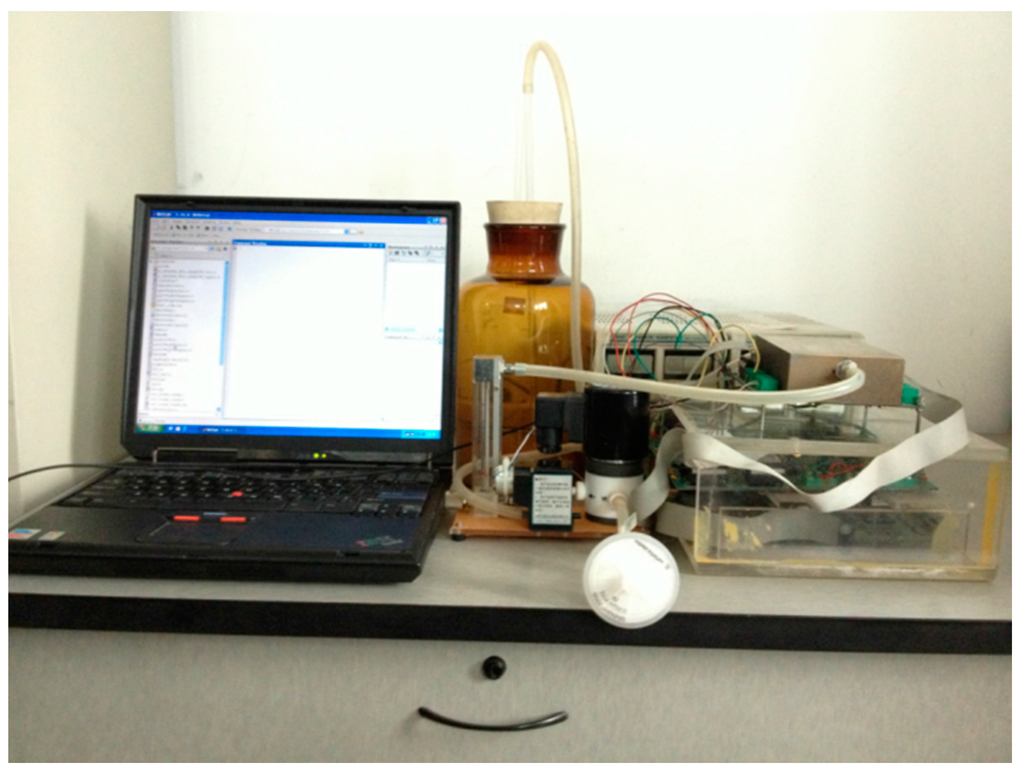 The practical E-nose system is shown in Figure 2. The gas sensor array is placed in a stainless steel test chamber coated by Teflon with the volume of 240 mL. A triple valve is used to change the gas circuit to make sure the desired gas can flow into the chamber. The flow velocity of gas is controlled by a flow meter and a mini-pump, and its value is set as 80 mL/min. The response curves of the sensor array obtained from the wound odor of rats are firstly conditioned through a conditioning circuit and then sampled and saved in a computer via a 14-bit data acquisition system (DAS). A schematic diagram of the experimental system is shown in Figure 3.