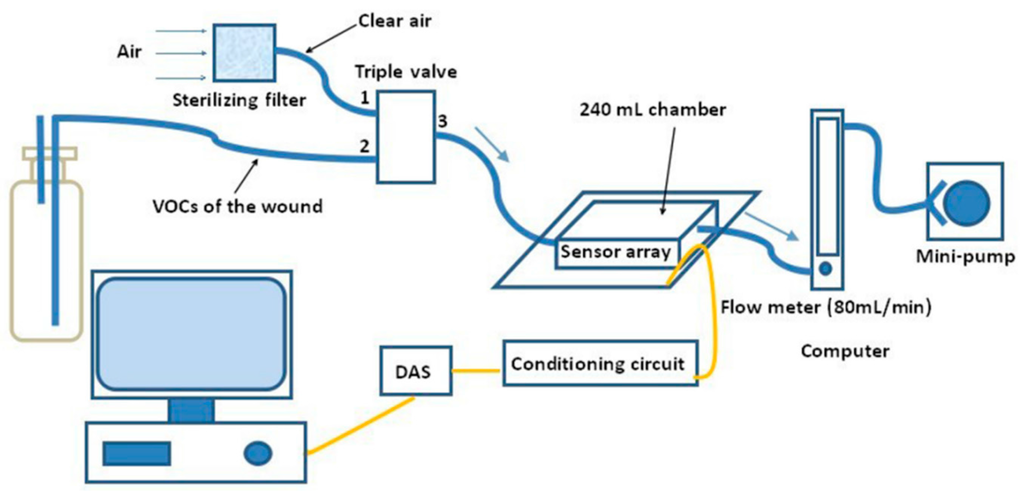 Step 2: Set the triple valve to make port 2 connect to port 3, so the gas stream containing VOCs of the wound passes over the sensor array for 5 min;