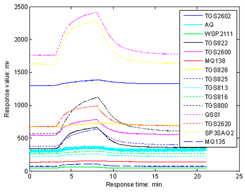 The clearance time between two experiments is 5 min. Twenty sampling experiments for each group of rats are made under the same conditions, and thus 80 sampling data sets can be collected. The response curves of 15 sensors on one wound infected with P. aeruginosa are shown in Figure 4. It can be seen that the obvious rise of each response curve is from the third min when the gas stream containing VOCs of the wound begins to pass over the sensor array, and the curves begin to drop from the eighth min when clean air is exposed to wash the sensor array.