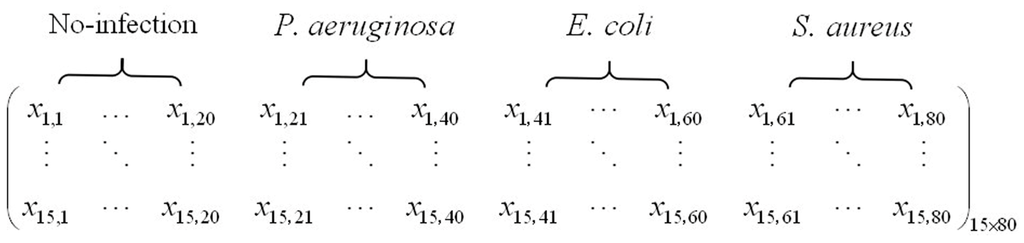 After all the sampling experiments have been finished, we succeed in extracting the maximum steady-state response value of each sensor during each sampling experiment, and then the original feature matrix of the wound infection data is constructed. The detailed information of this original feature matrix is shown in Figure 5. As it shows, there are 80 points in this matrix and the dimension of each point is 15. Each class of wound infection contains 20 points.